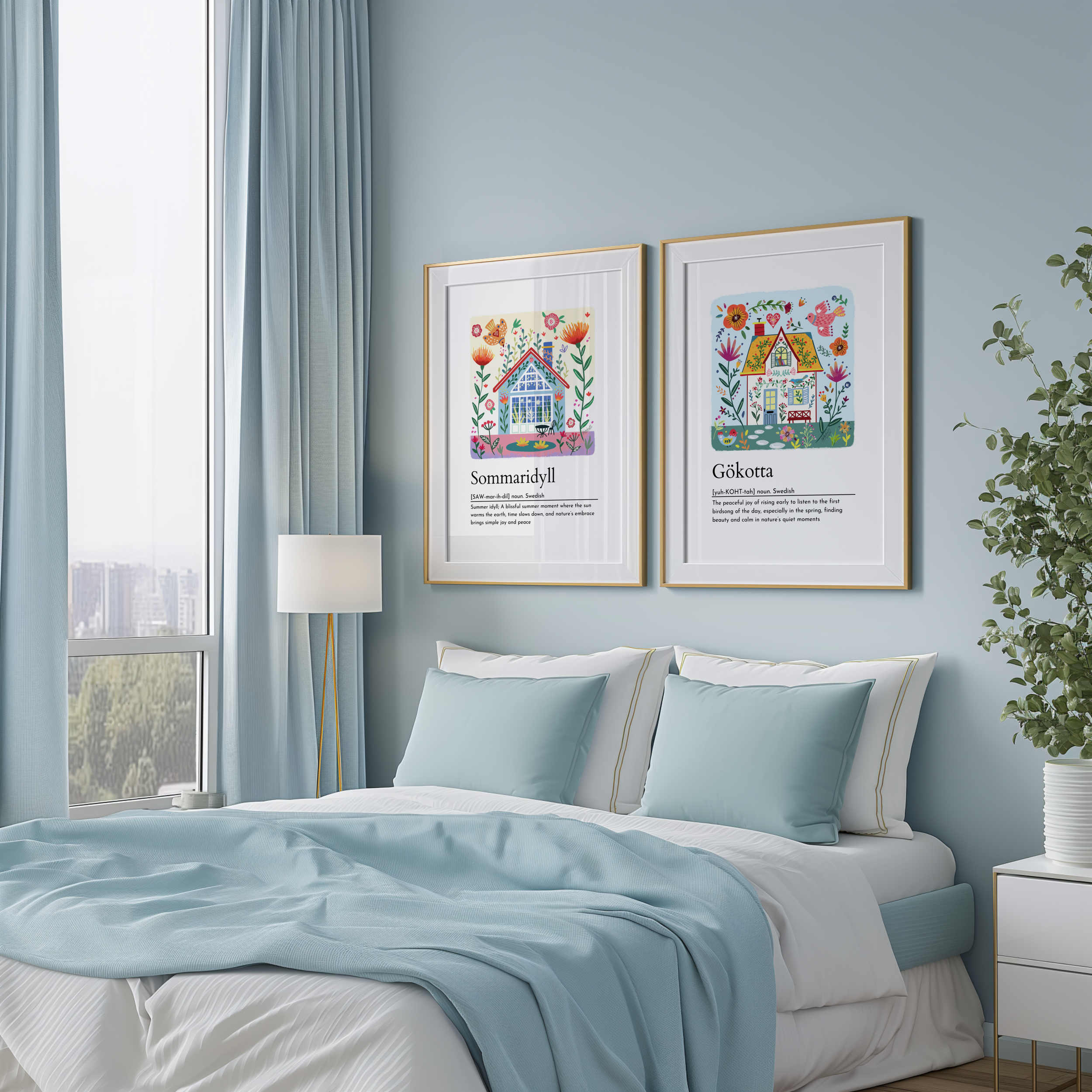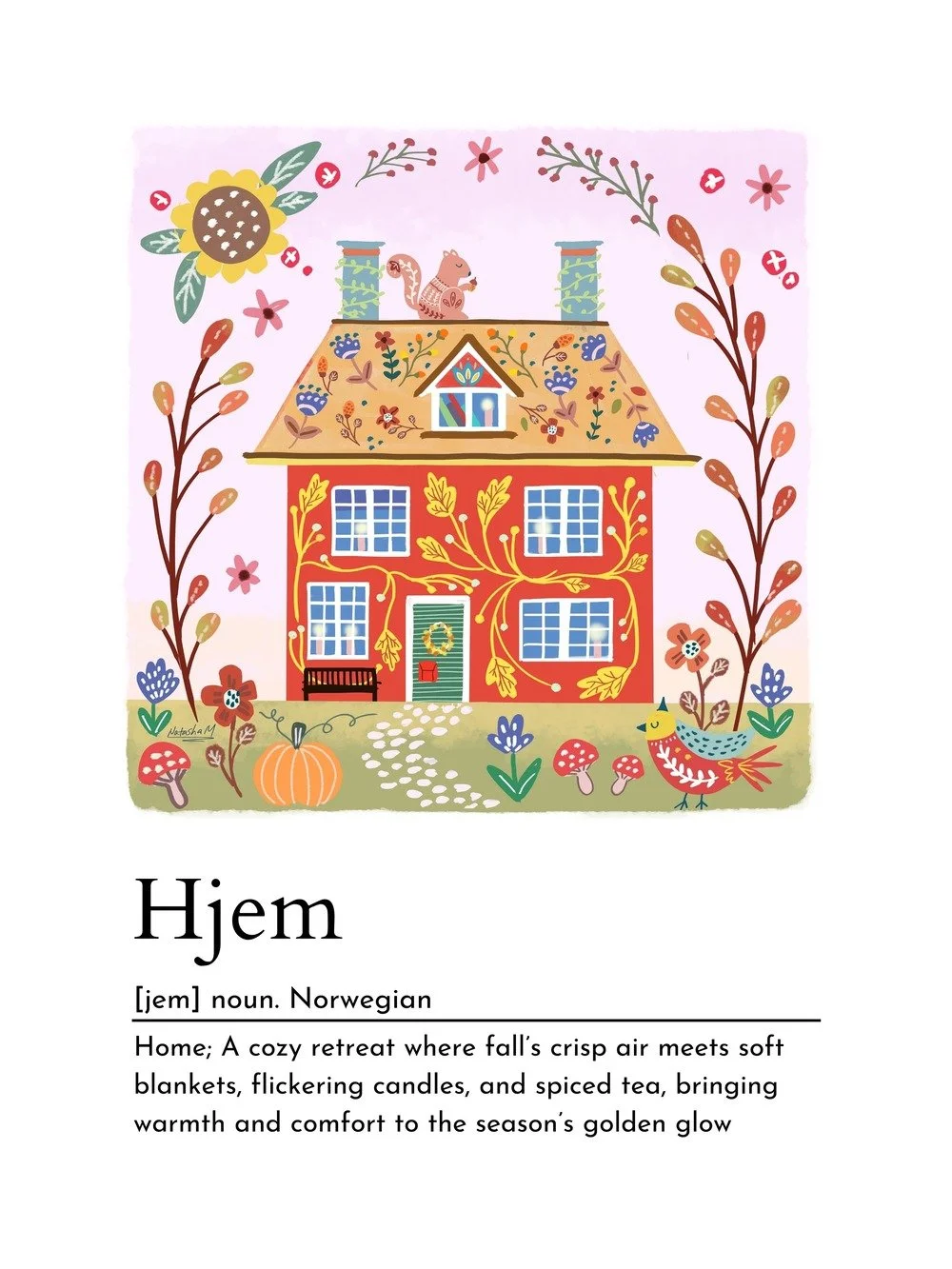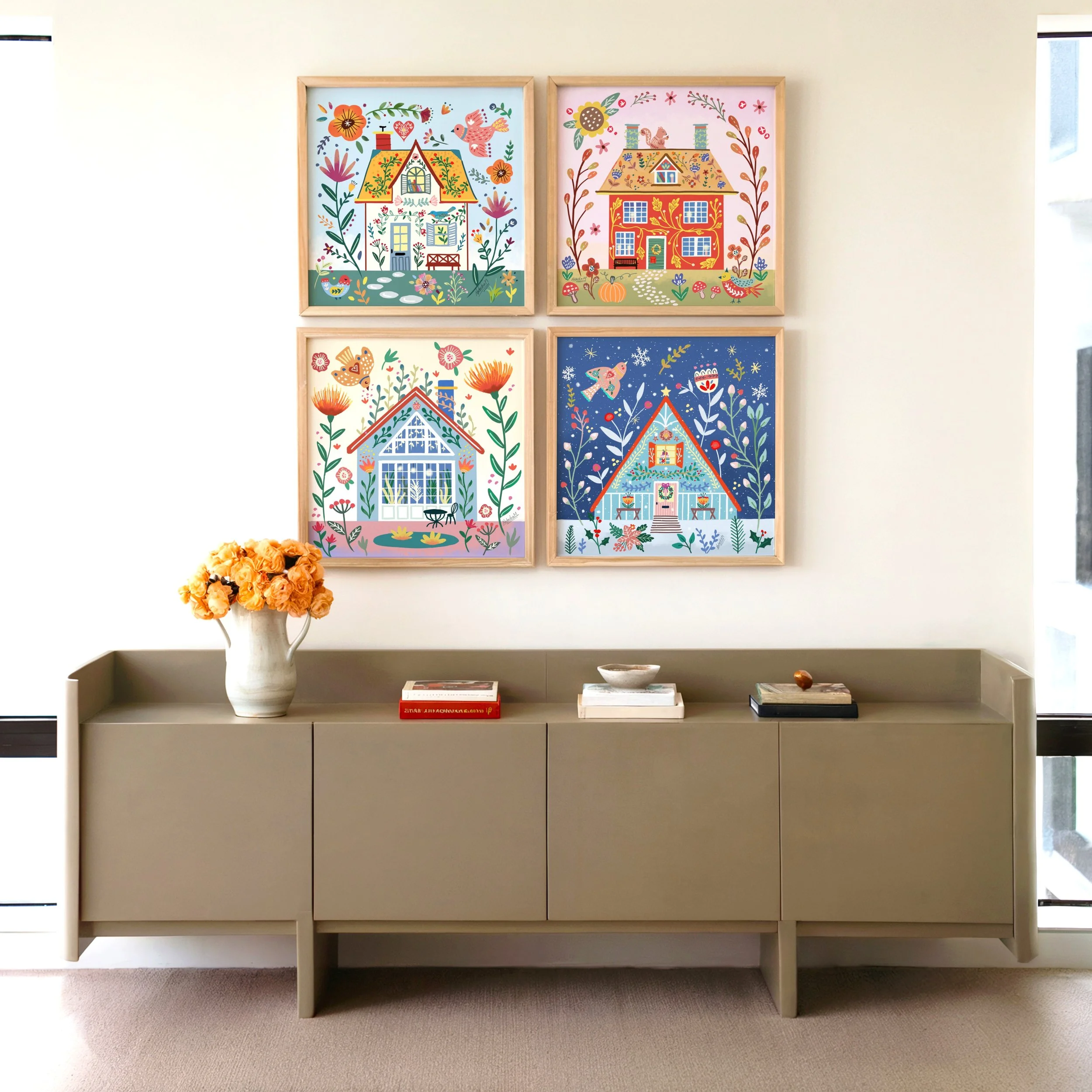 Rooted in Scandinavian folk art, this whimsical set of four illustrations each captures a cozy house nestled in florals and natureācelebrating the colors and charm of the changing seasons.